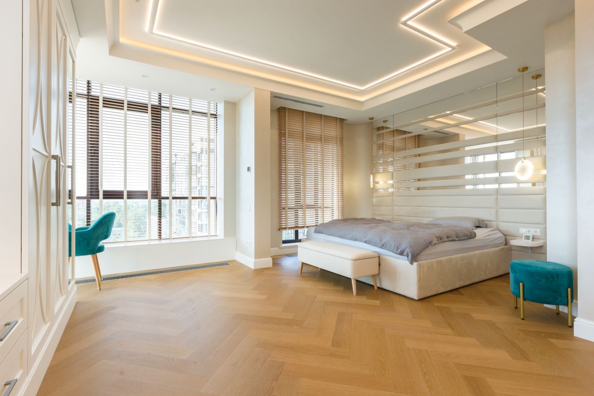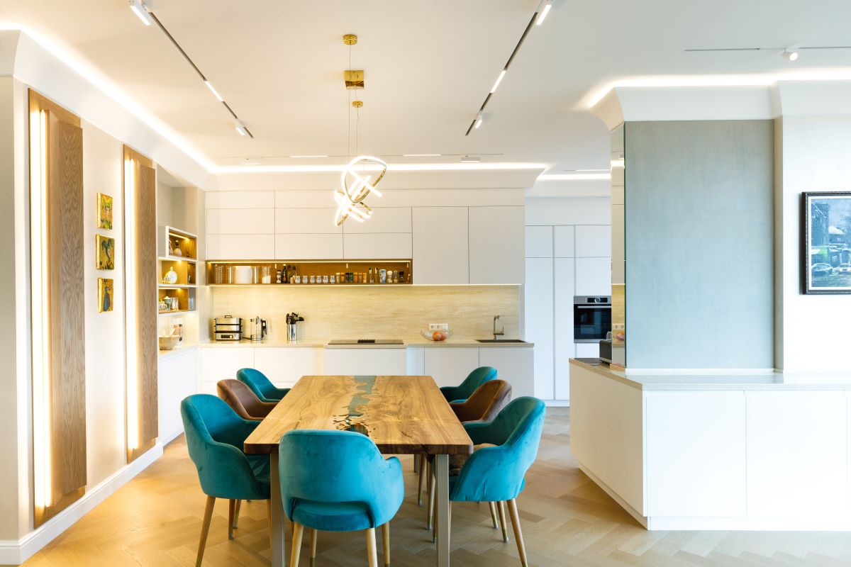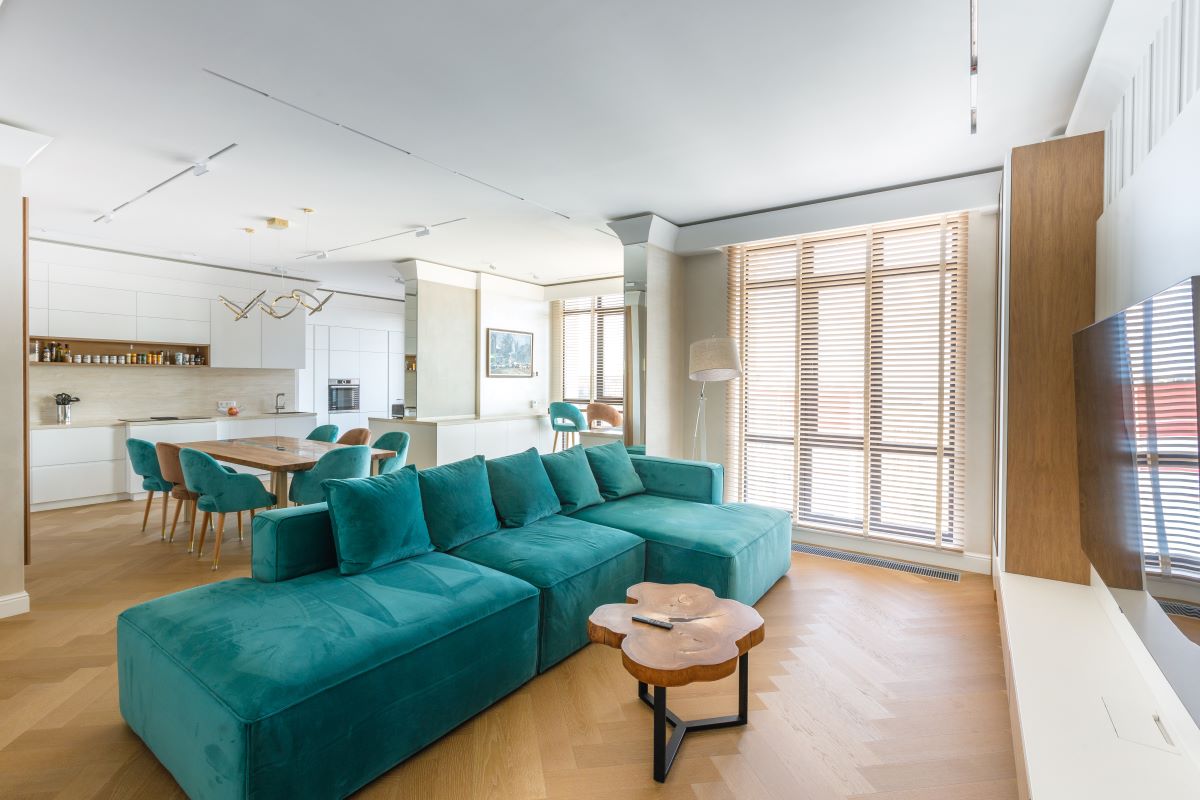 Гармоничный интерьер, наполненный прямыми линиями и световыми акцентами, украшает мебель насыщенного бирюзового цвета.