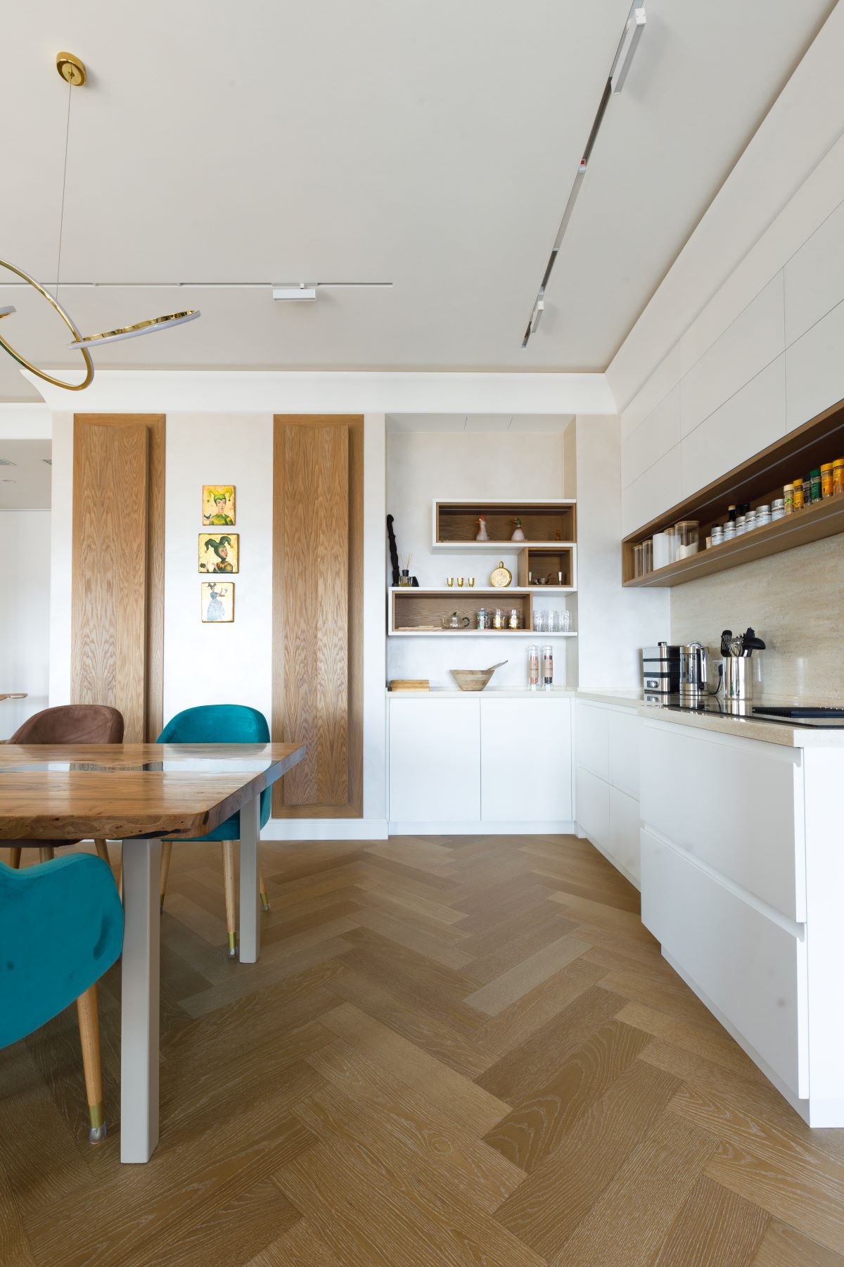 Чистота белого и геометрия линий смягчаются деревом и мягким матовым текстилем.