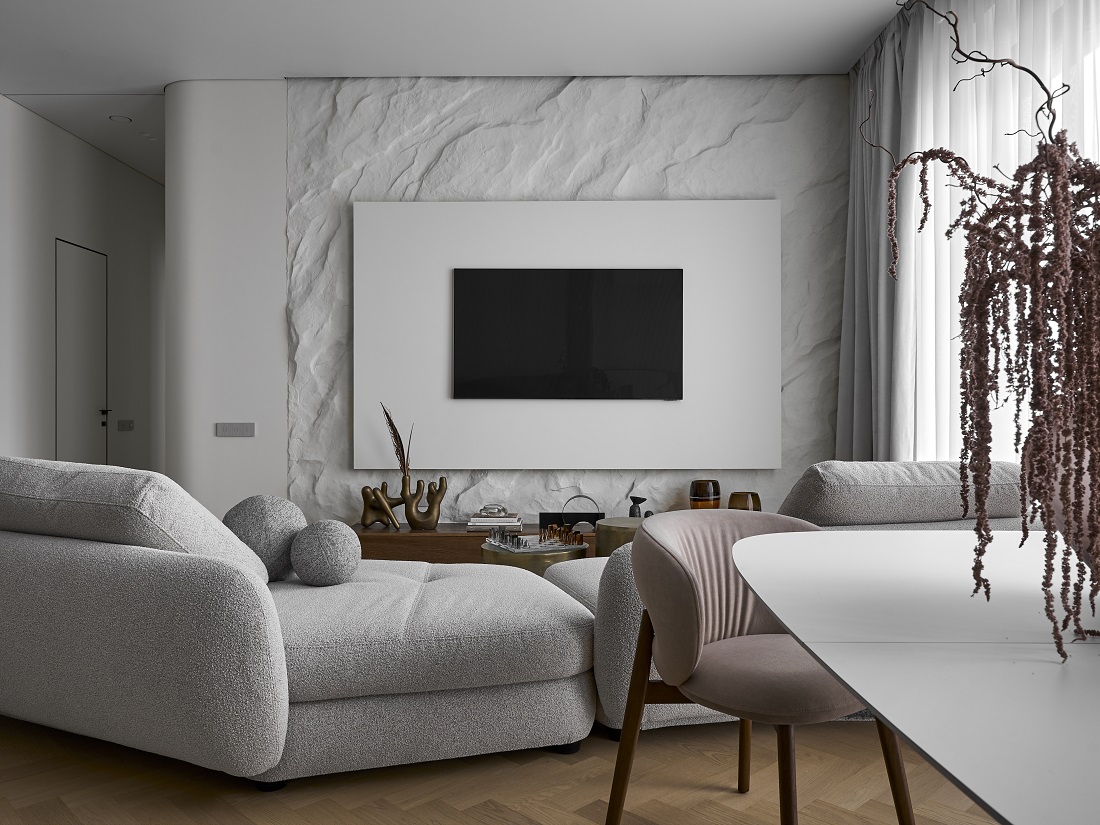 Квартира в ЖК AFI Park Воронцовский в Москве площадью 98 кв.м в минималистичном стиле — это интерьер, где нет ничего лишнего, при этом есть и декор, и детали.